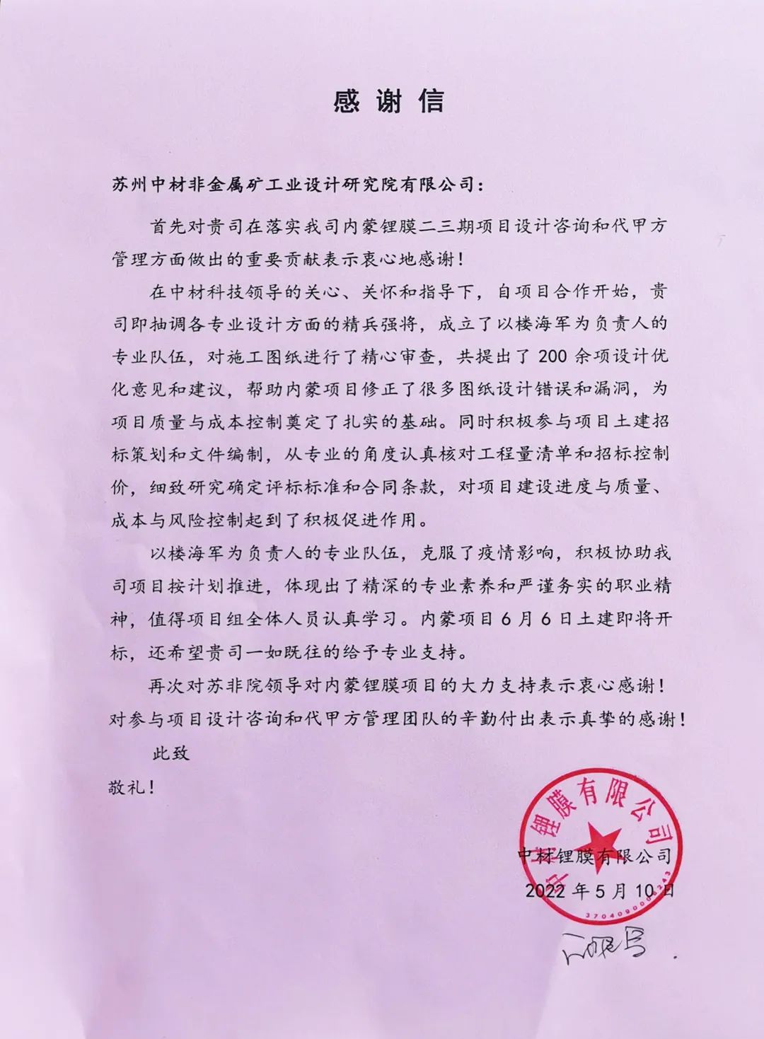 近日,蘇州非礦院收到中材鋰膜有限公司發來的感謝信。信中指出:由內蒙鋰膜承建的“年產1.6億平方米鋰電......