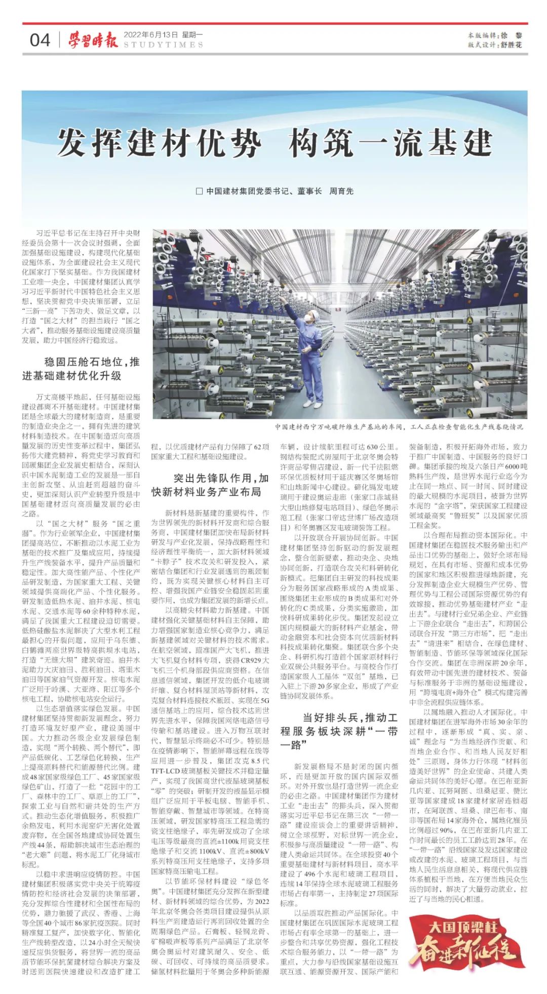 6月13日,《學習時報》的“大國頂梁柱 奮進新征程”專欄刊發了中國建材集團黨委書記、董事長周育先署名......