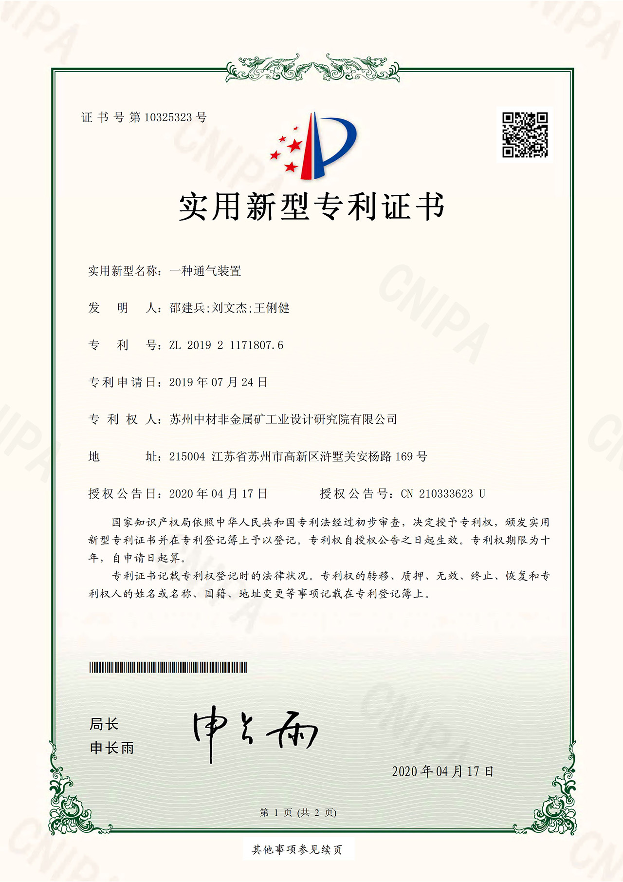 實用新型專利證書-一種通氣裝置
