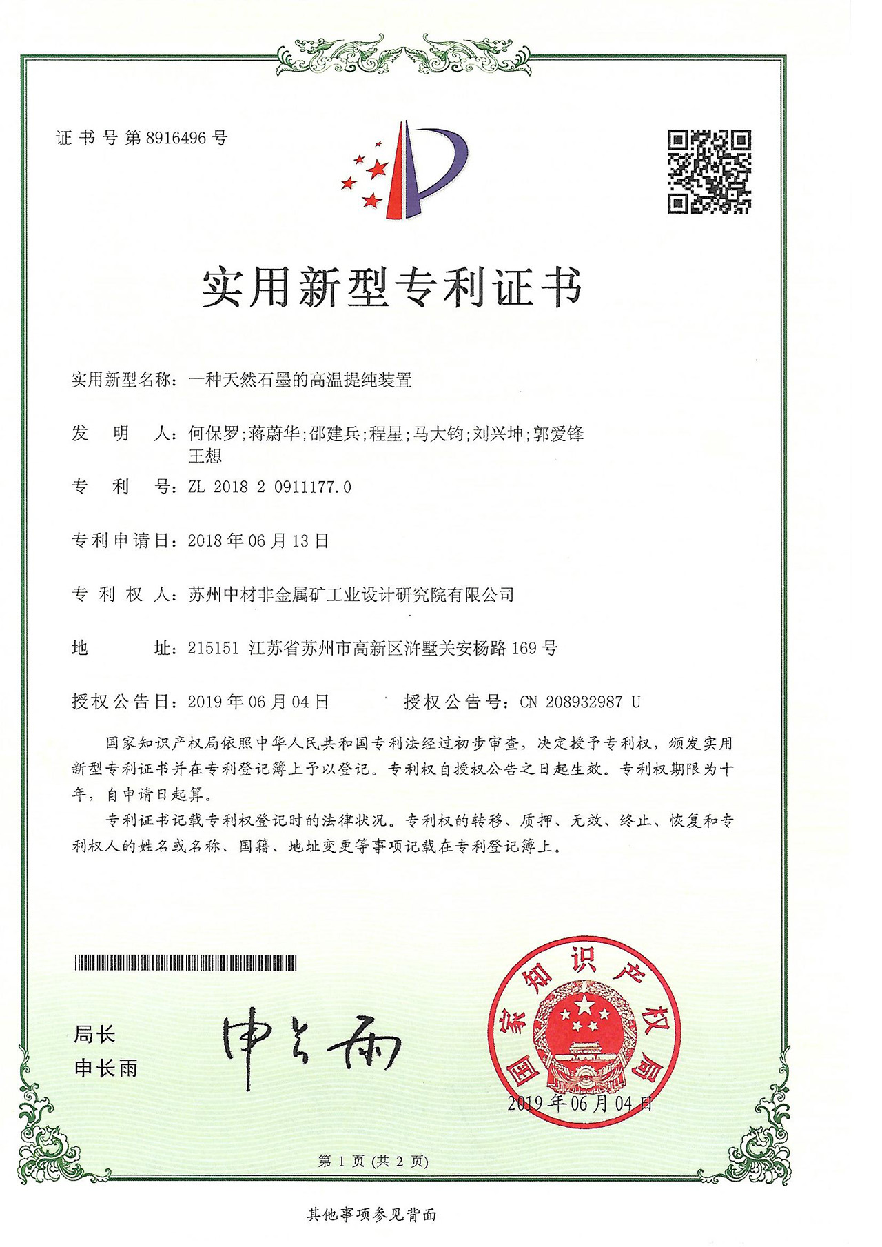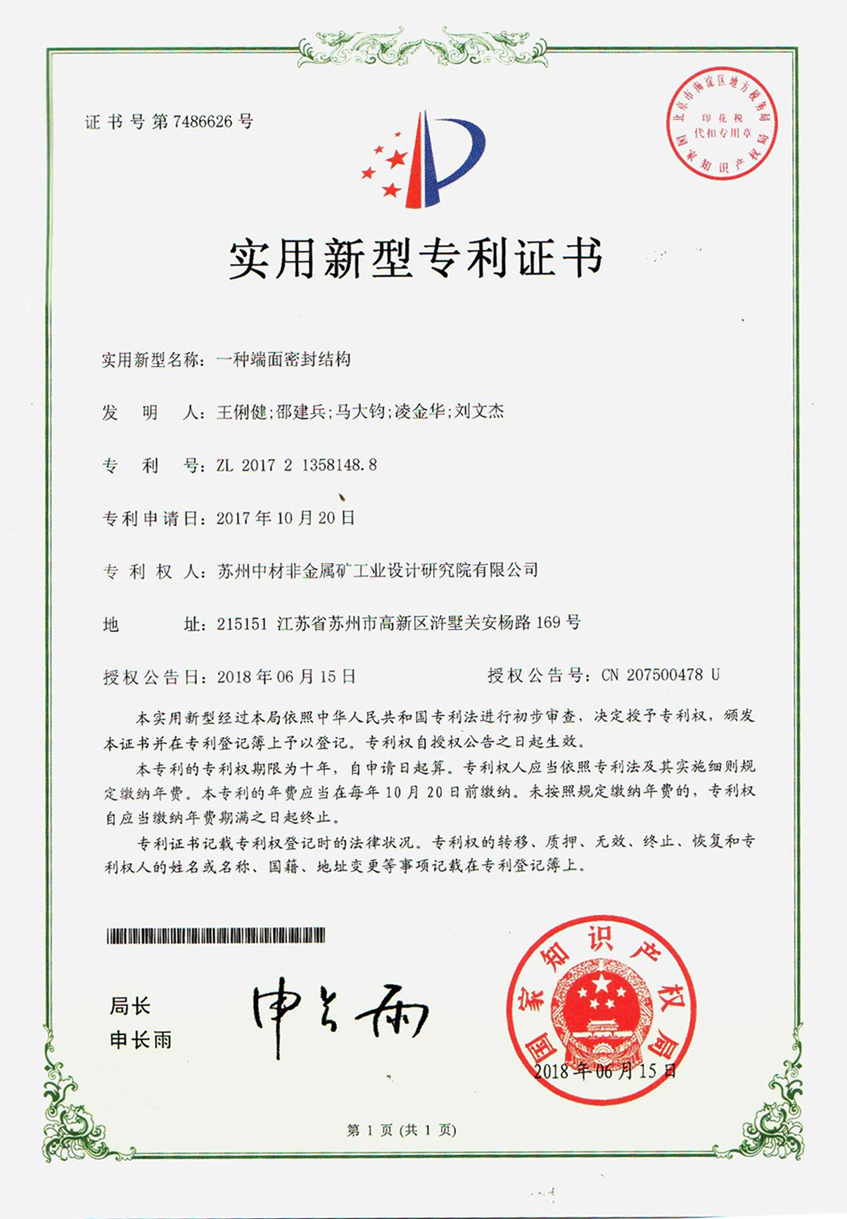 實用新型專利證書-一種氣刷裝置