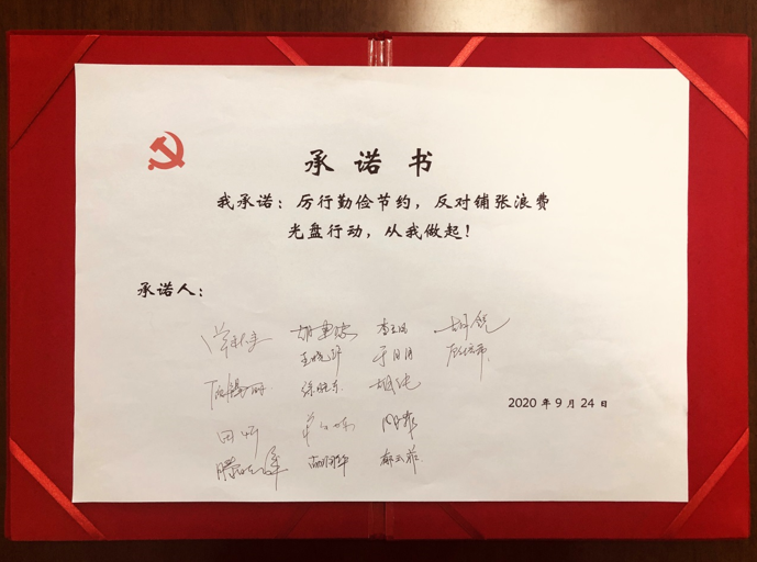 公司黨群辦制作“珍惜糧食、杜絕浪費”專欄,加大宣傳力度,號召全體黨員在活動中發揮帶頭作用。各黨支部圍繞“厲行節約,反對浪費”主題積極開展了黨日活動,第三黨支部別出心裁地用黨員手舉打印的漢字排成“厲行節約、反對浪費”的口號,表達了黨員同志們踐行節約理念的決心;第五黨支部組織黨員在“光盤行動、從我做起”的承諾書上簽字,自覺將勤儉節約、艱苦奮斗的理念內化于心、外化于行。