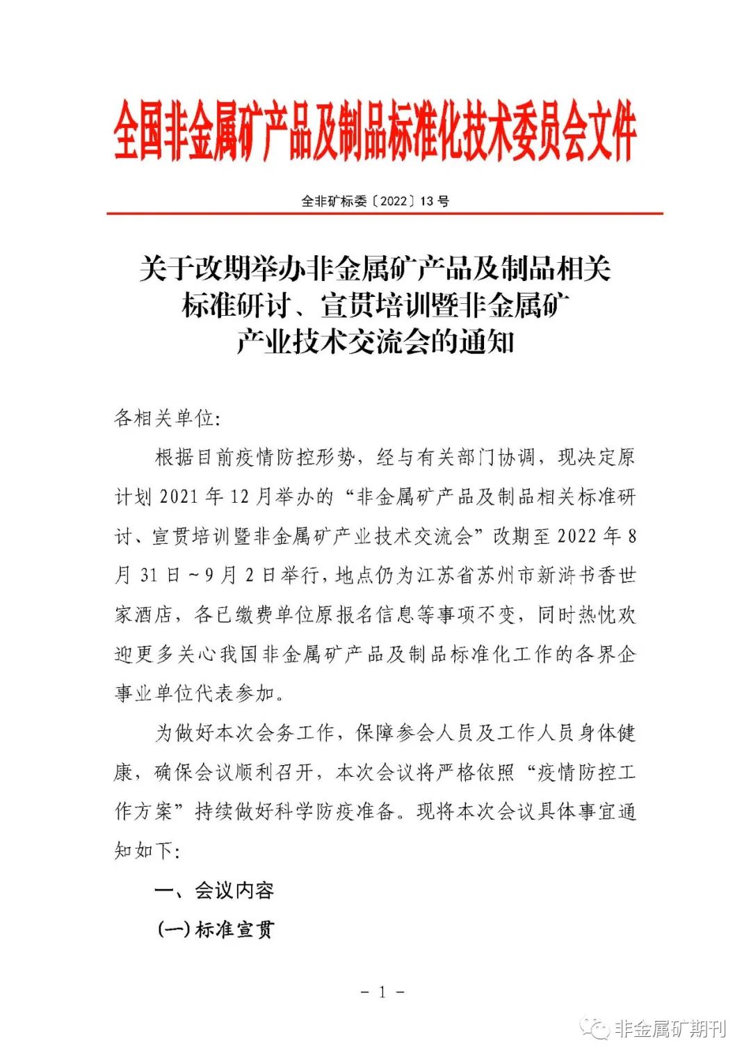 重要通知!!!非金屬礦產品及制品相關標準研討、宣貫培訓暨非金屬礦產業技術交流會